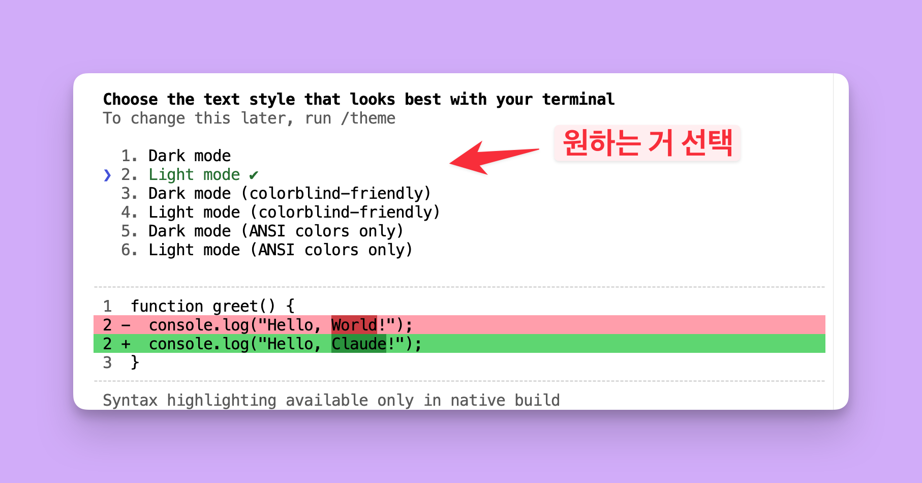 Ctrl + `) claude입력 → Enter- 테마 선택 → Light 또는 Dark 선택 (아무거나 OK)