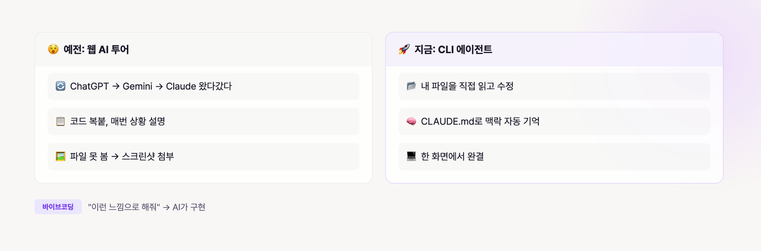| 바이브코딩 | 의도만 말하면 AI가 만들어줌 | 전문가가 옆에서 같이 작업 |