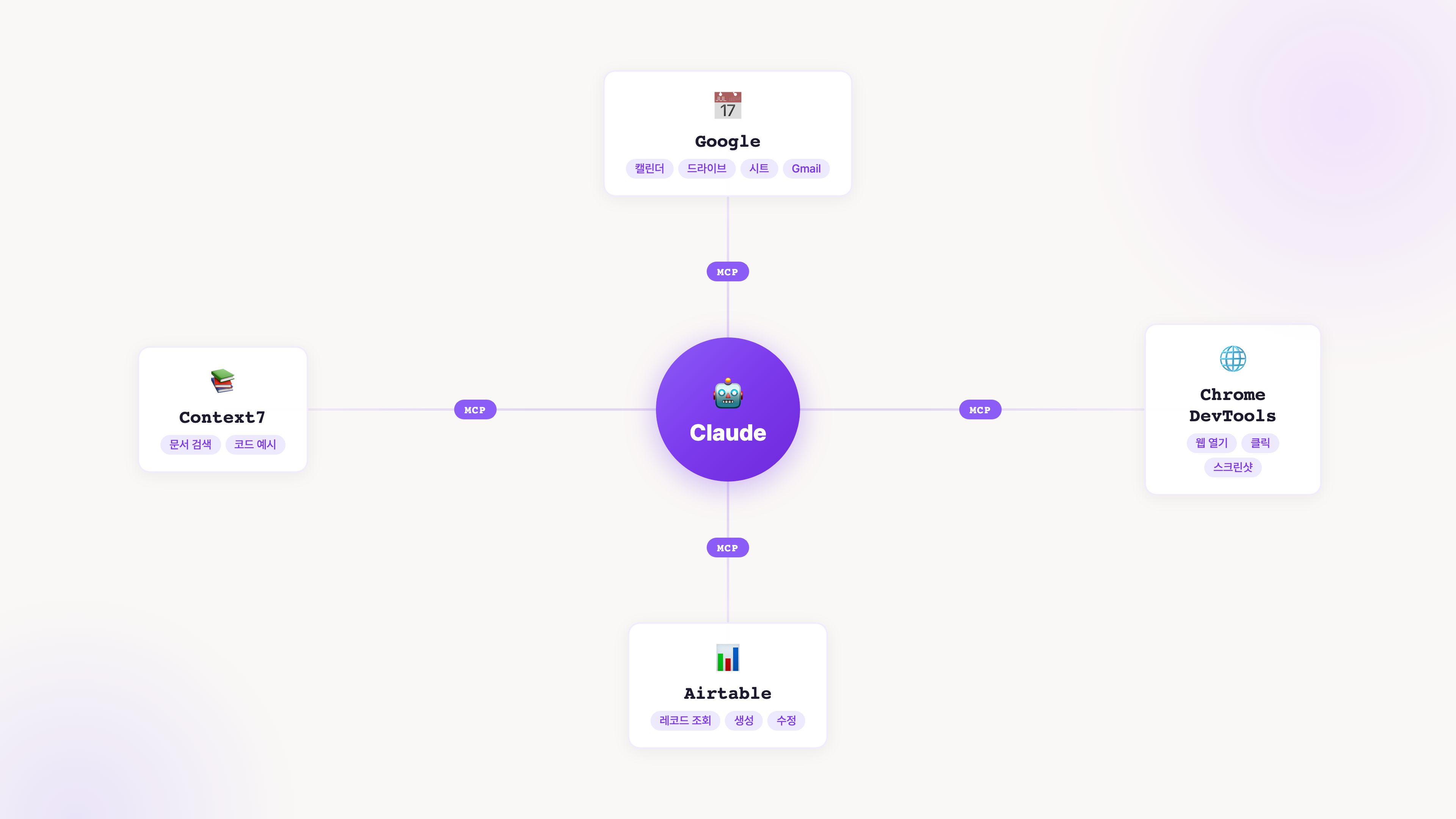 USB-C 하나로 충전기, 모니터, 키보드 다 연결하듯이, MCP 하나로 Airtable, Gmail, 브라우저 등 다양한 서비스에 연결합니다.